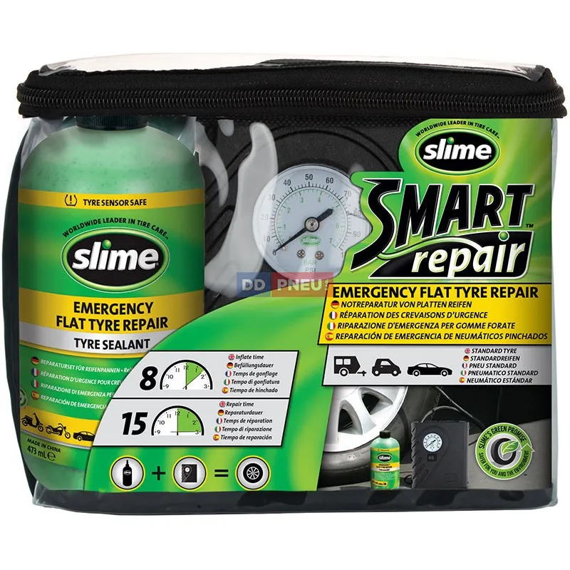 Poloautomatická opravná sada Slime Smart Repair je patentovaný systém umožňující opravit prázdnou pneumatiku a to pouze za 15 minut a tím minimalizovat čas strávený na nebezpečné silnici. Již není nutné čekat na odtah, nebo spoléhat na nebezpečné aerosolové huštění pneumatik.